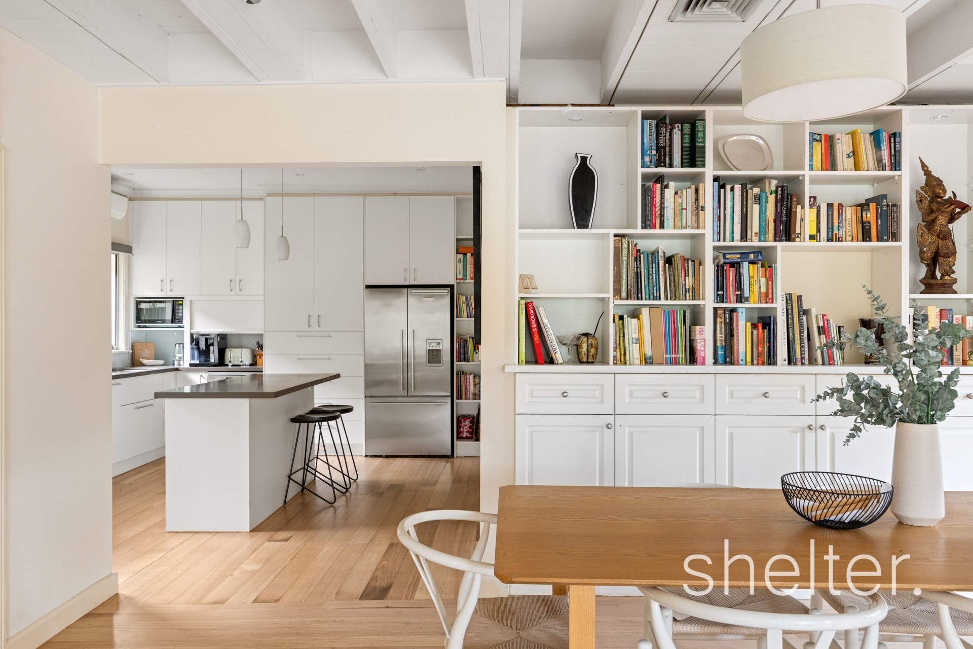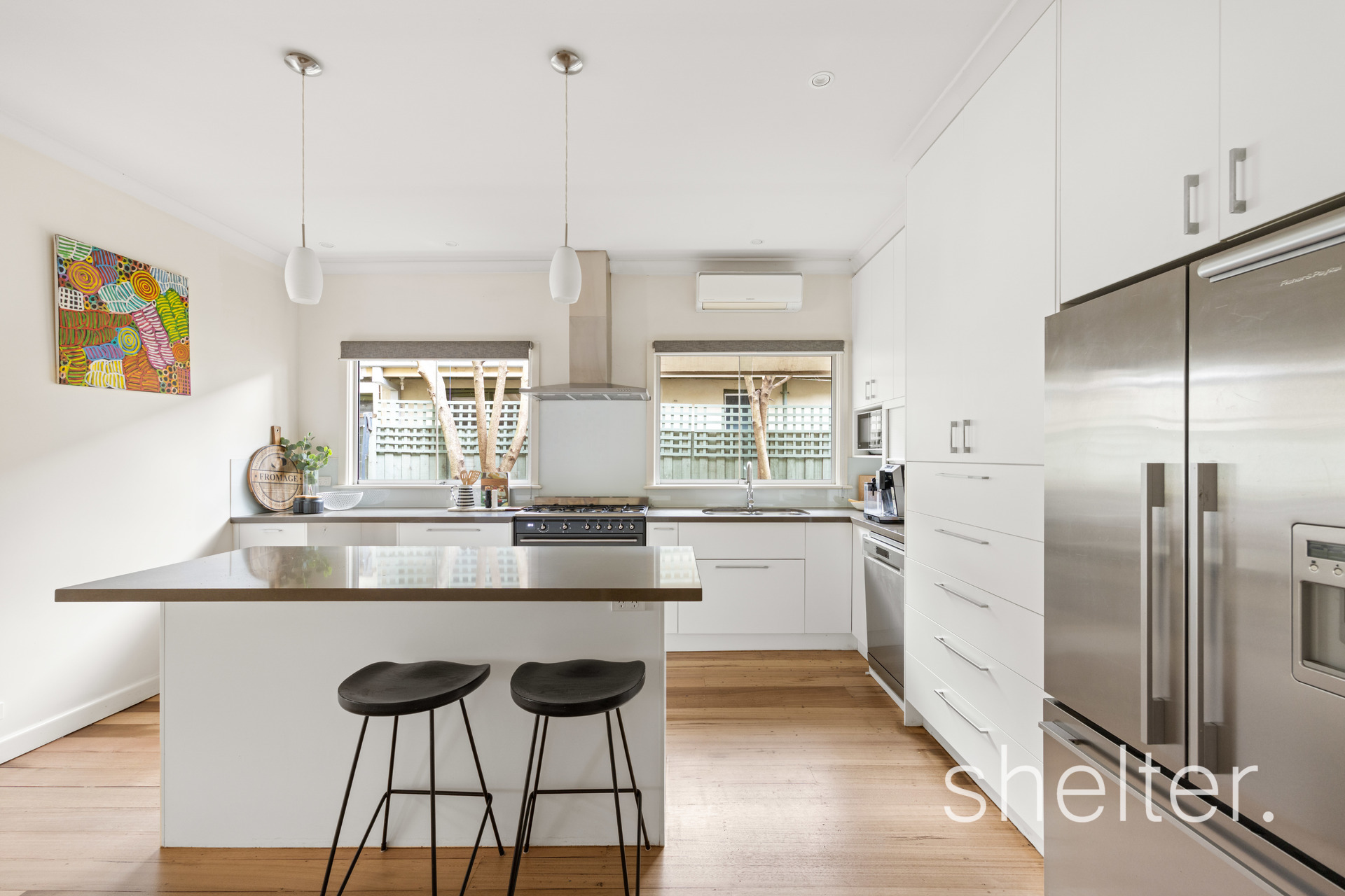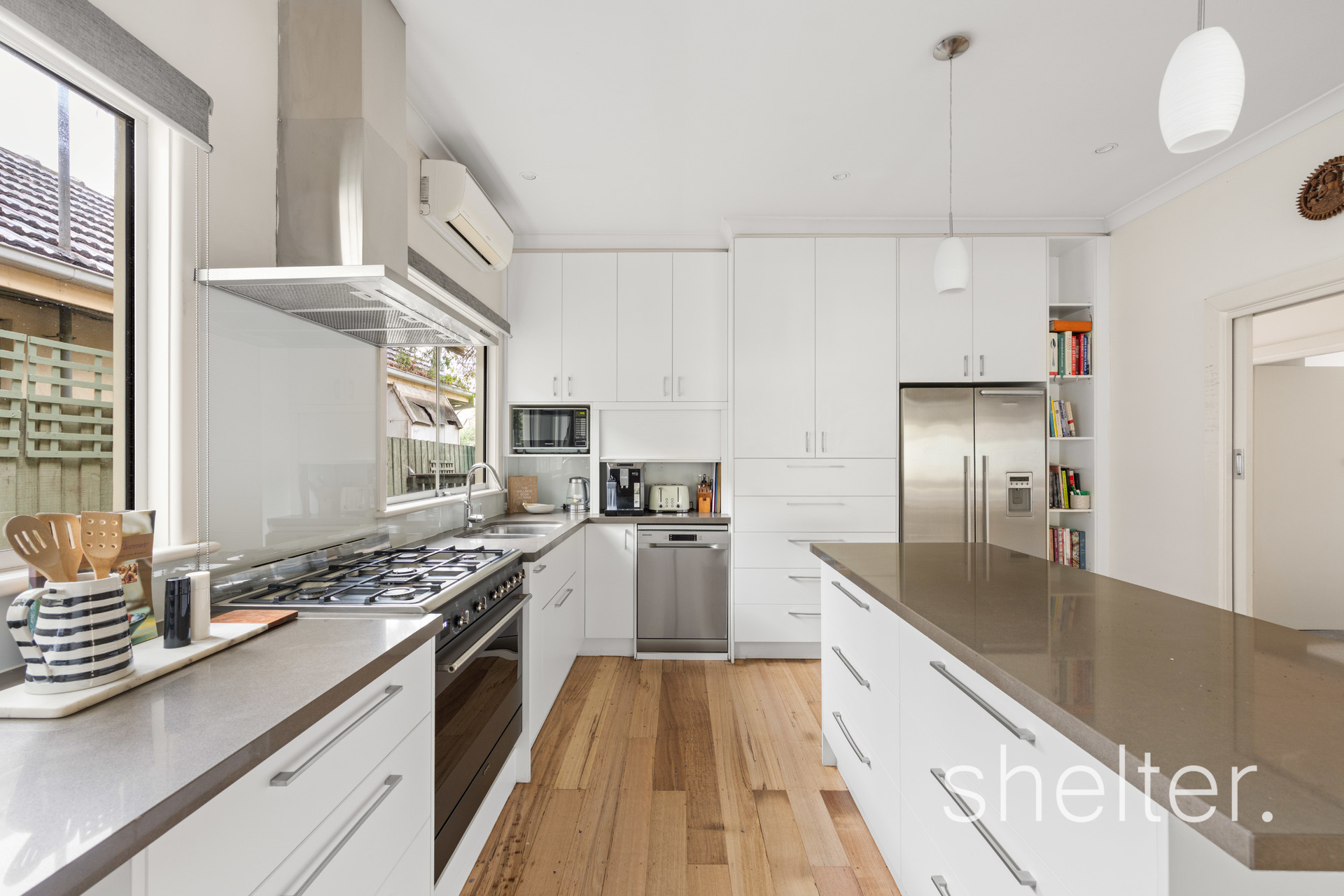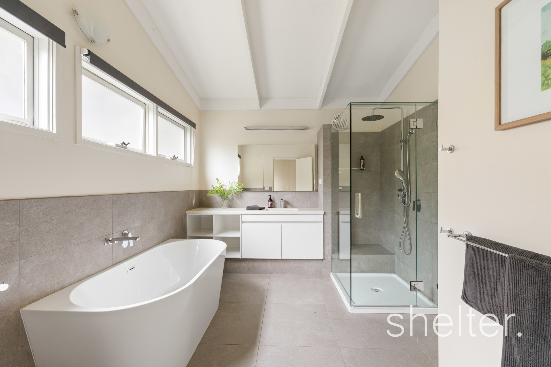 Centrally positioned, the renovated kitchen appointed with abundant storage, stone benchtops, dishwasher and a Smeg industrial sized gas cooktop and oven flows through to the expansive dining and living domain warmed by the gas log fire. Glass sliders open the living space to an extensive paved patio providing the idyllic space for entertaining family and friends in the sunshine; embraced by serene, established gardens attracting native birds. Upstairs, zoned accommodation comprises a main suite with an exclusive undercover terrace balcony and a luxe dual access bathroom featuring a soak tub while two further bedrooms fitted with built in robes share a balcony overlooking the rear garden.