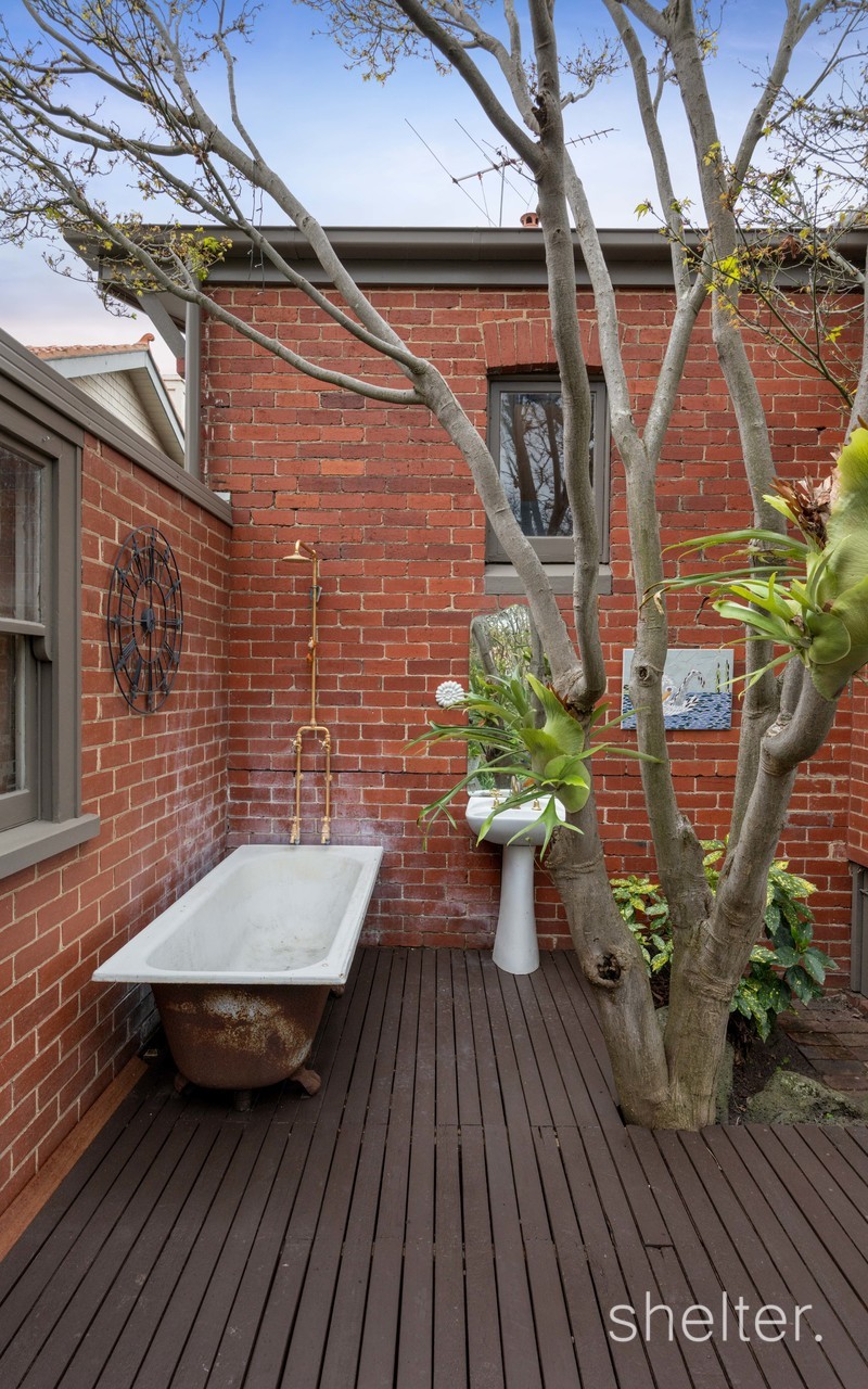 At the heart of the home, the kitchen is fitted with a striking Aga cooker – a nod to the home’s heritage – while the large rear deck provides an inviting space for outdoor entertaining. Overlooking a private and leafy garden, the backyard includes the unique addition of an outdoor bath and shower with hot and cold water, offering a sense of retreat and relaxation. A wine cellar, a roof space attic, and ample off-street parking for up to four vehicles all contribute to the property’s overall comfort and convenience.